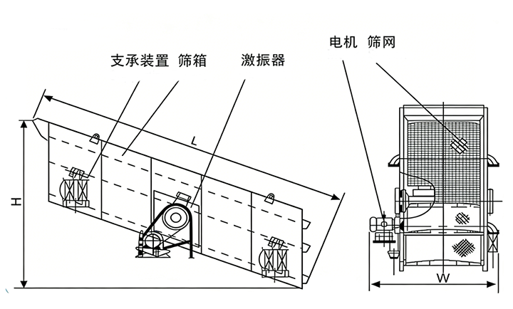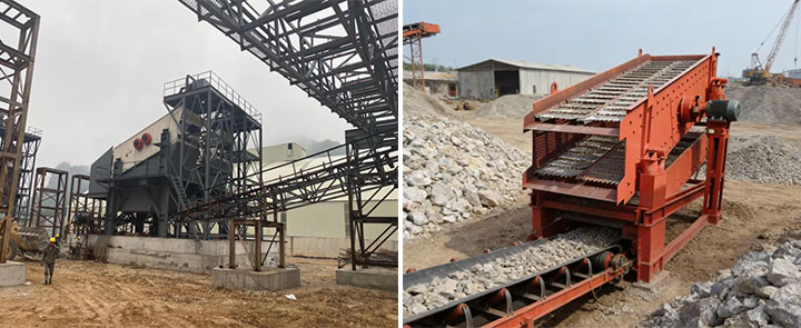 在石英砂生产流程中,原矿首先经破碎、制砂处理后进入筛分工序。石英砂由皮带机输送至圆振动筛给料口,在偏心激振力作用下,筛箱作圆周运动,石英砂在筛面上筛面上抛起、扩散。筛分后的粗颗粒、细颗粒等石英砂可以在筛网下方配皮带机,然后不同的皮带机将不同粒径的石英砂送到不同的生产环节,实现连续性的生产流程。